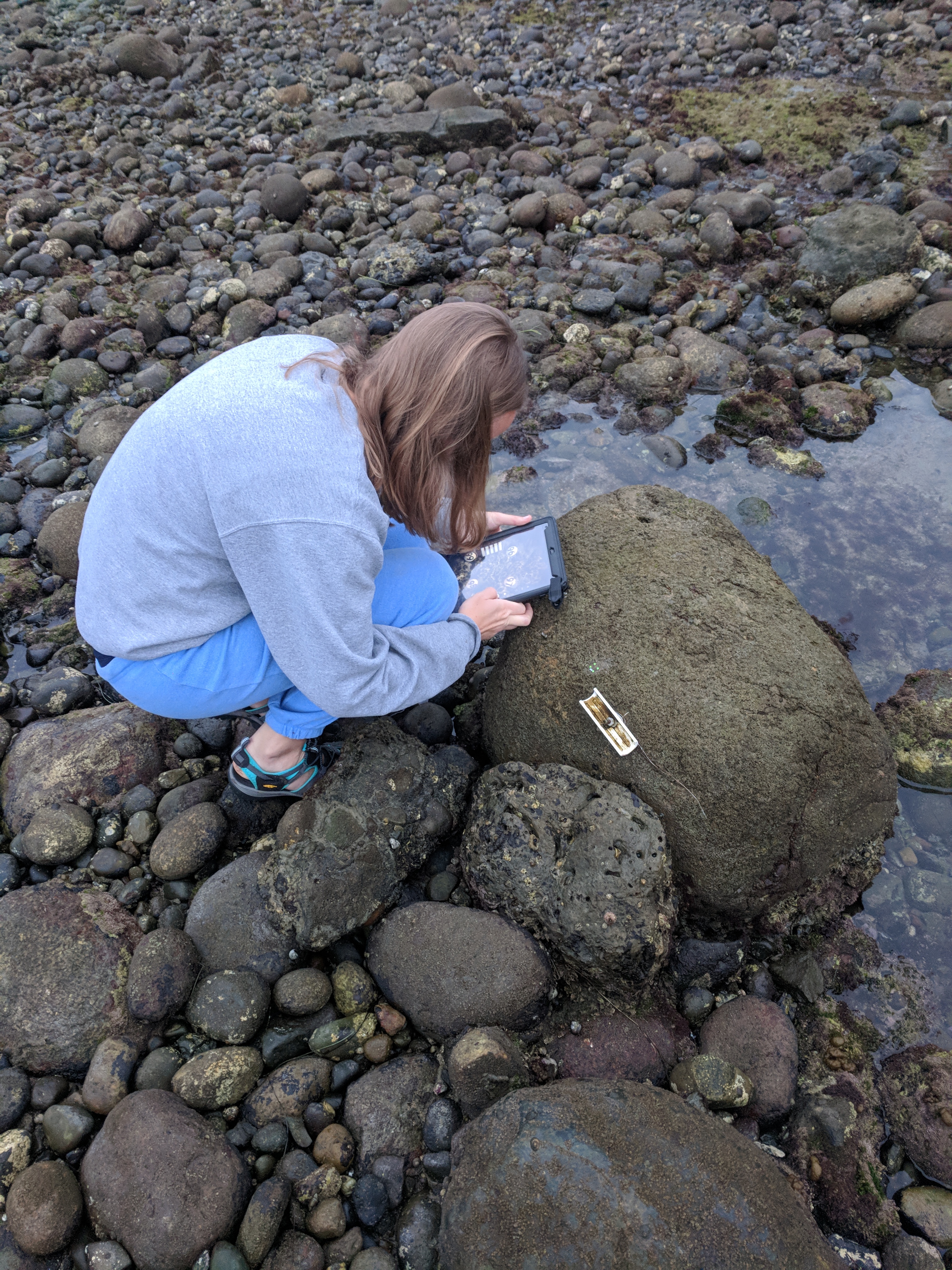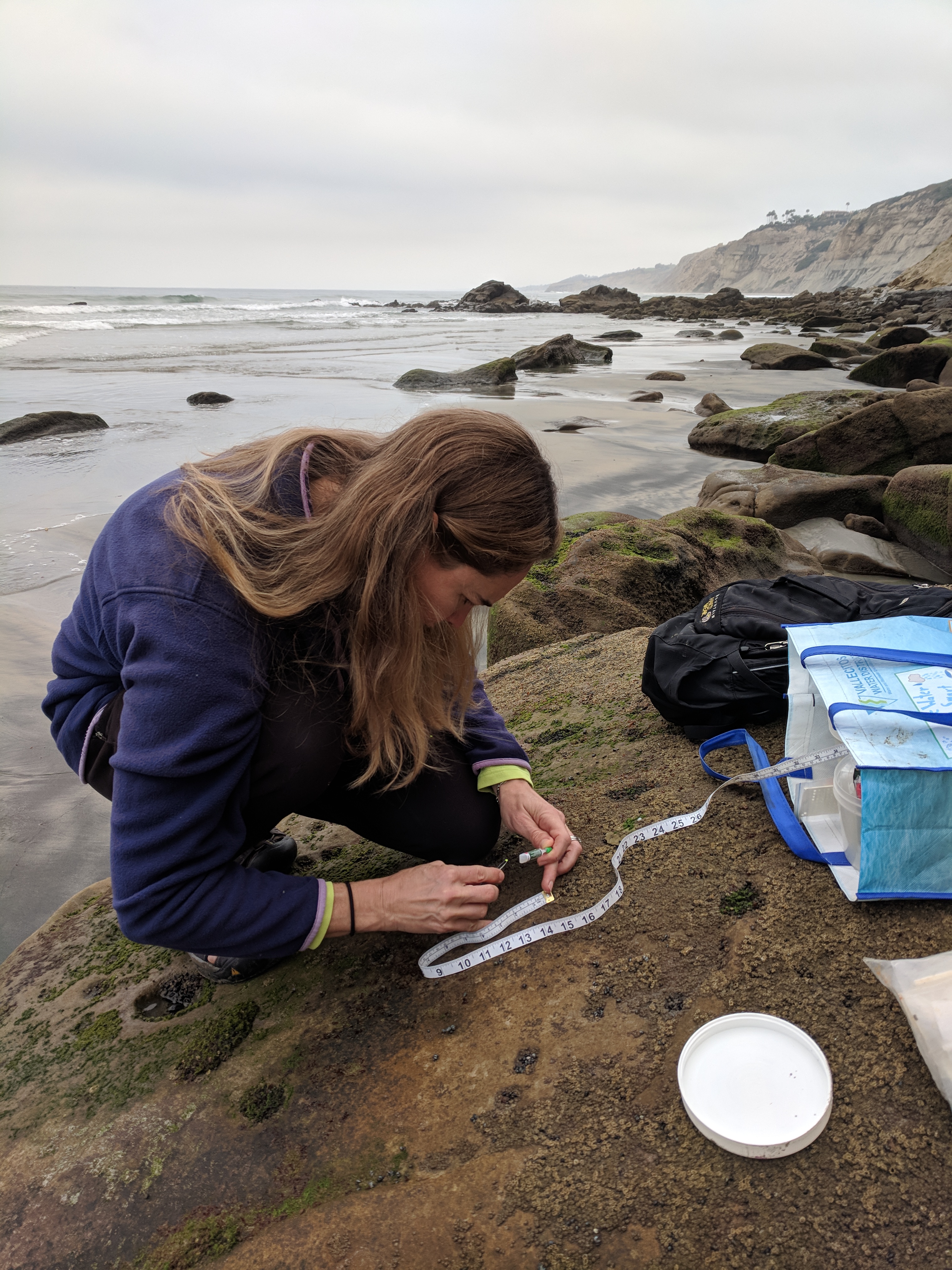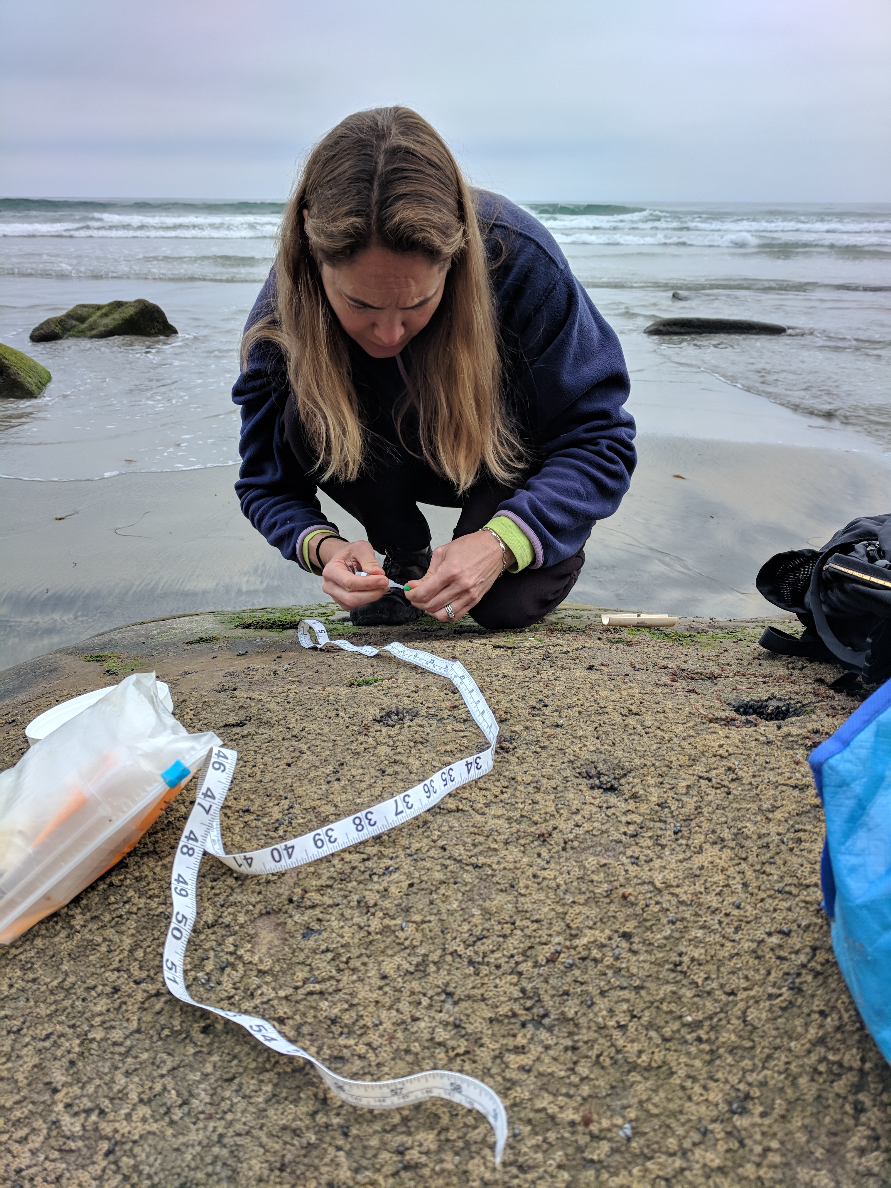 - Nathalie Reyns tagging barnacle plots in the rocky intertidal for post-settlement mortality study.