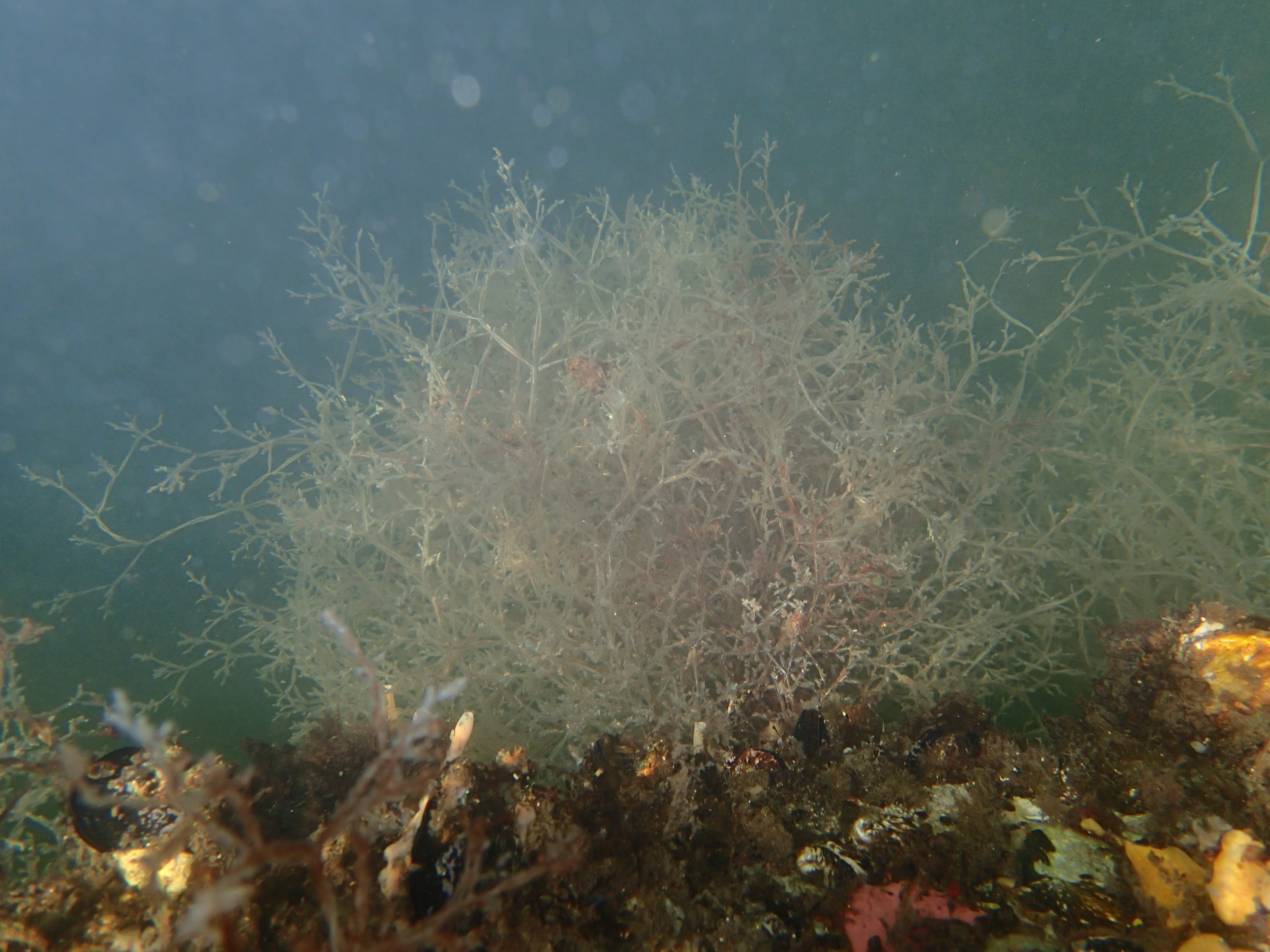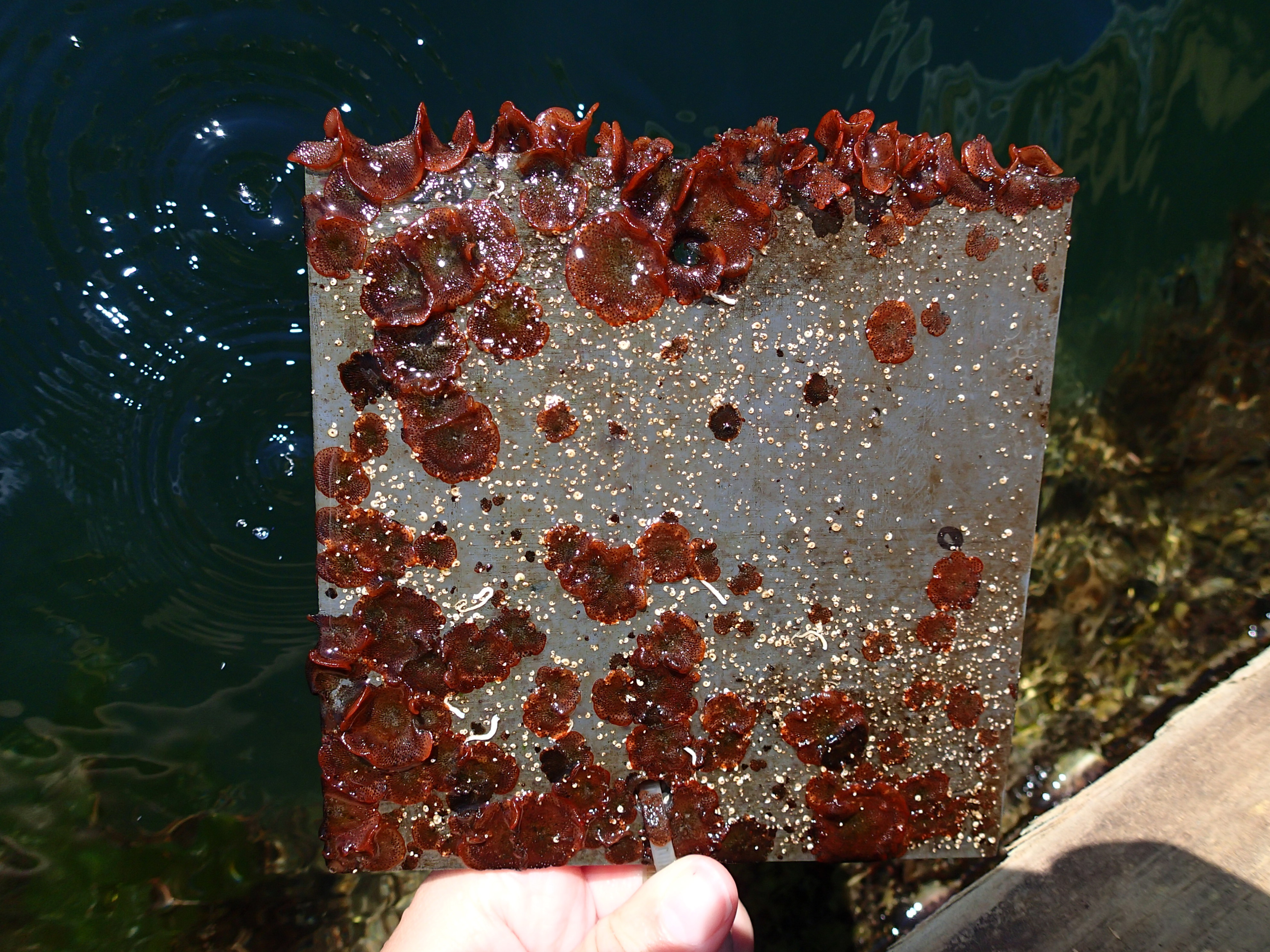 Fouling communities are dominated by non-indigenous, or invasive, species, but diversity of these organisms varies by location within Mission Bay (Tracy 2013, Tracy and Reyns 2014). Additionally, some non-indigenous species such as the spaghetti bryozoan, Amathia verticillata, also serve as biogenic habitat for many other organisms, making their ecological role complicated (Zavacki et al. 2024, 2025). |