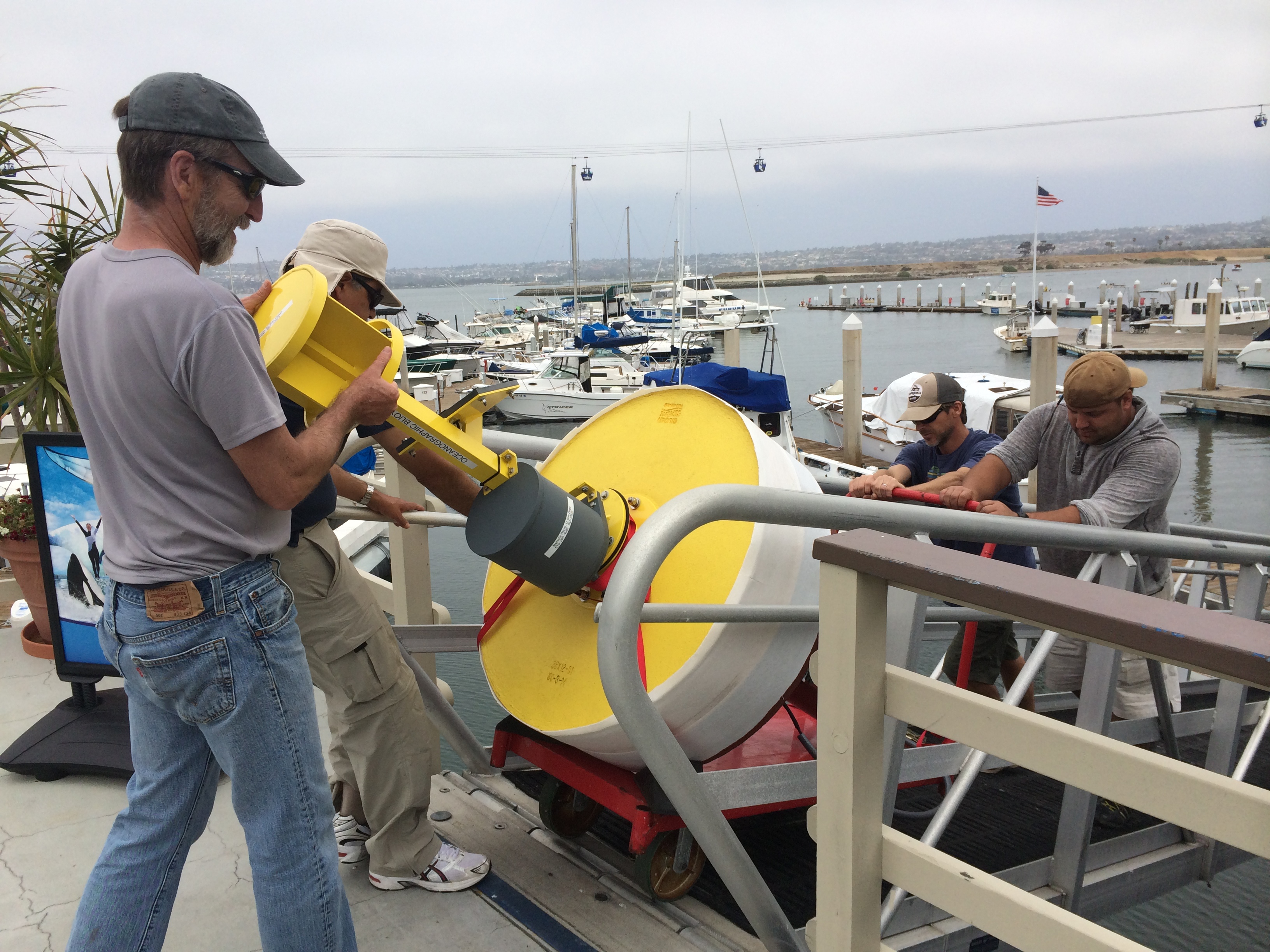| Since 2014, and with collaborators Jesús Pineda and Steve Lentz, we have been examining the biological and physical processes that influence larval transport in a nearshore, open-coast environment in the La Jolla, (San Diego) CA region. Our sampling takes place from the rocky intertidal to the water column extending 1 km offshore (~ 12m depth), and includes high-frequency physical sampling to measure currents, temperature, and pressure during spring-fall periods (see schematic for example deployment configuration). Biological sampling includes trap deployments to quantify barnacle larval supply, daily and weekly barnacle settlement collections, and vertically-stratified plankton sampling at stations 100-1000 m from shore. |